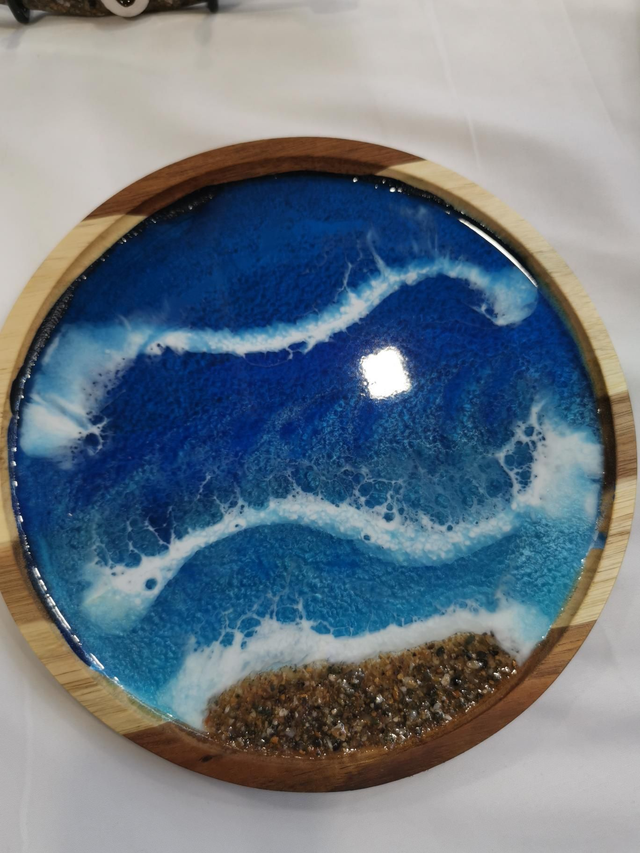 Small, wooden coffee tray, with seascape resin design, suitable for three cups. Approx 21cm diameter.