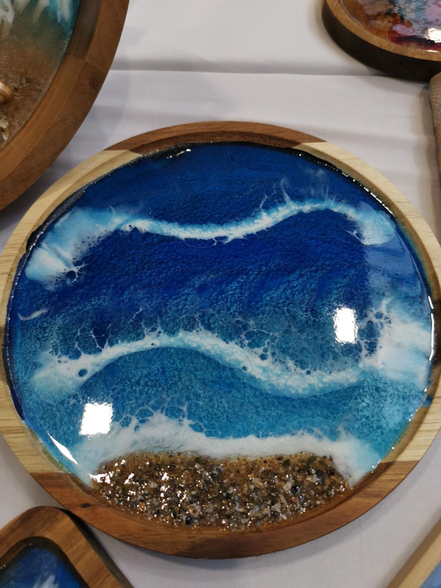 Small, wooden coffee tray, with seascape resin design, suitable for three cups. Approx 21cm diameter.