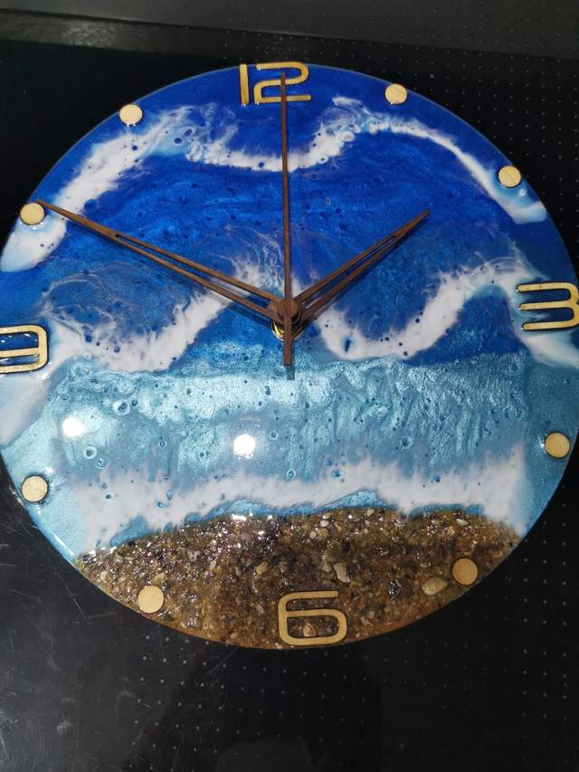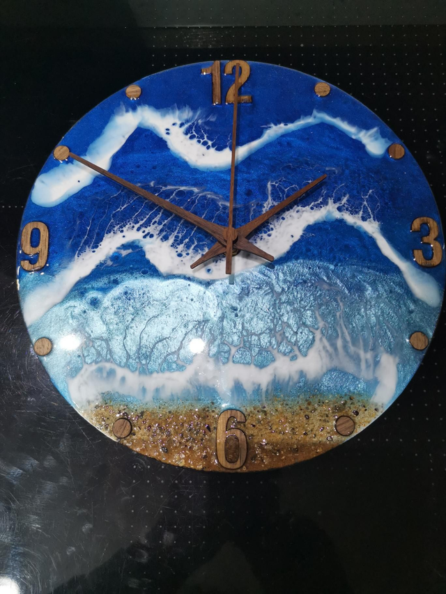 25cm diameter wooden backed resin clock with a seascape design. Hook for hanging is included. Requires 1 AA battery (not included)